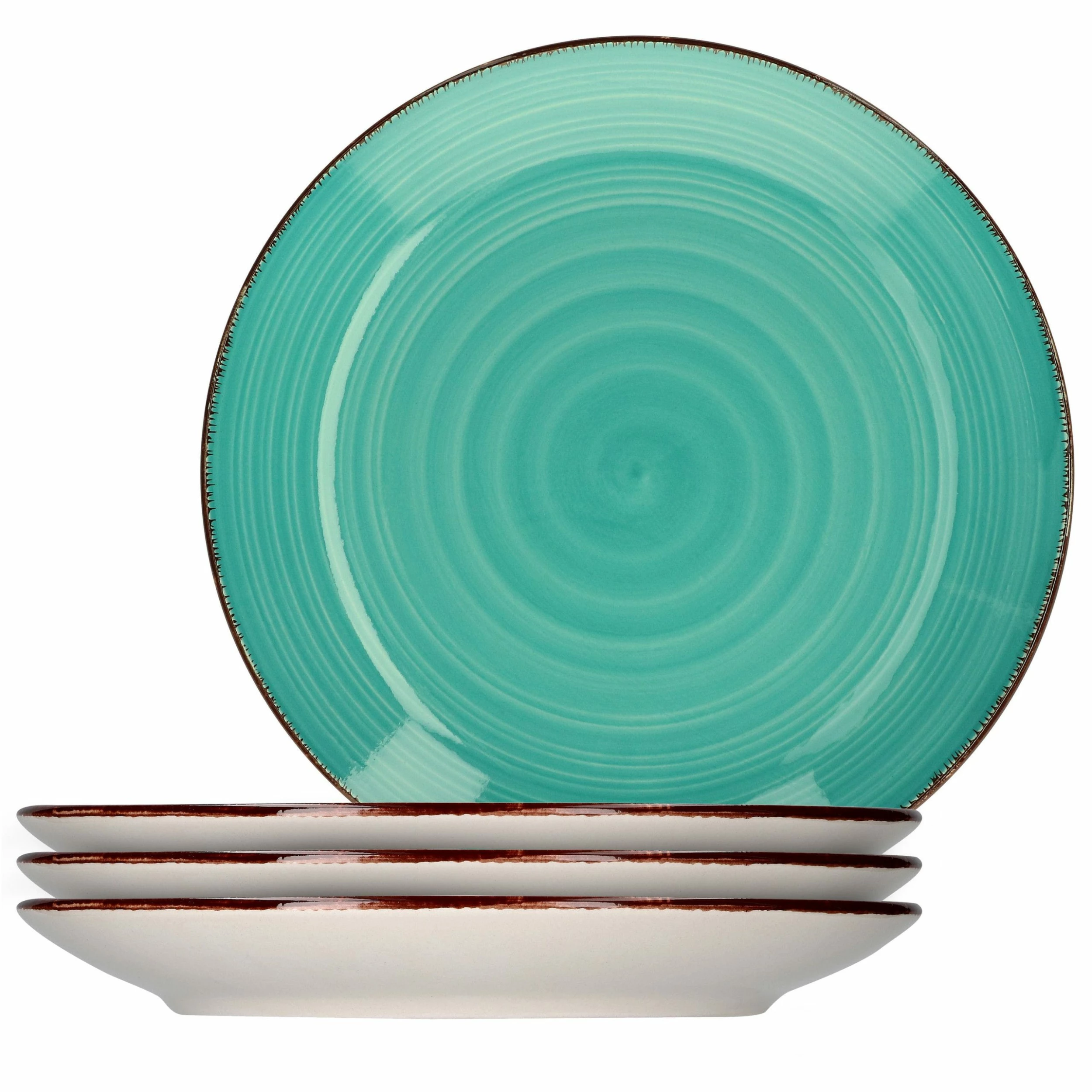 - Jeder Teller überzeugt mit einem Mintblauen Strudel-Dekor, welcher durch einen braunen Rand abgerundet wird und mit der creme-weißen Unterseite für einen schönen Kontrast sorgt