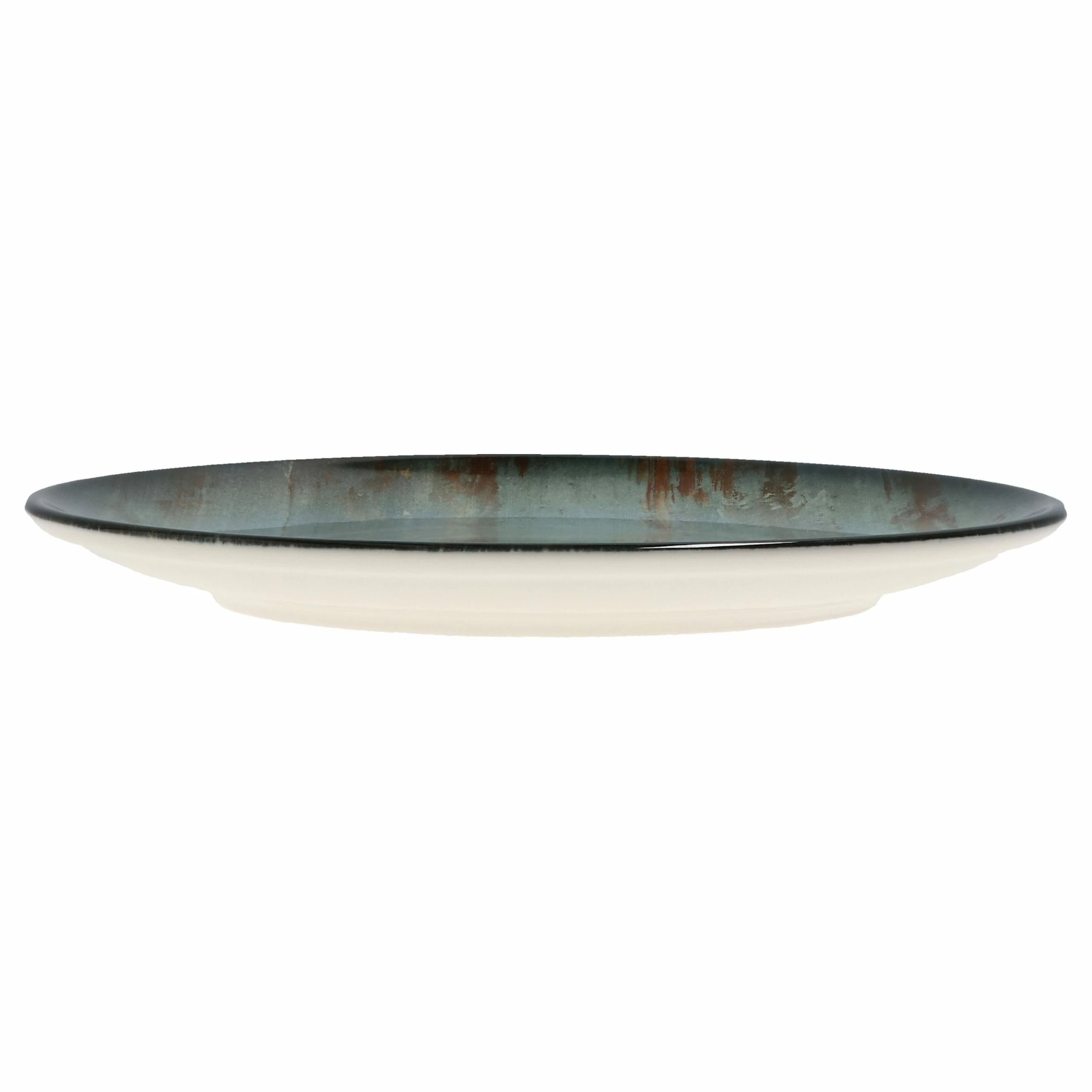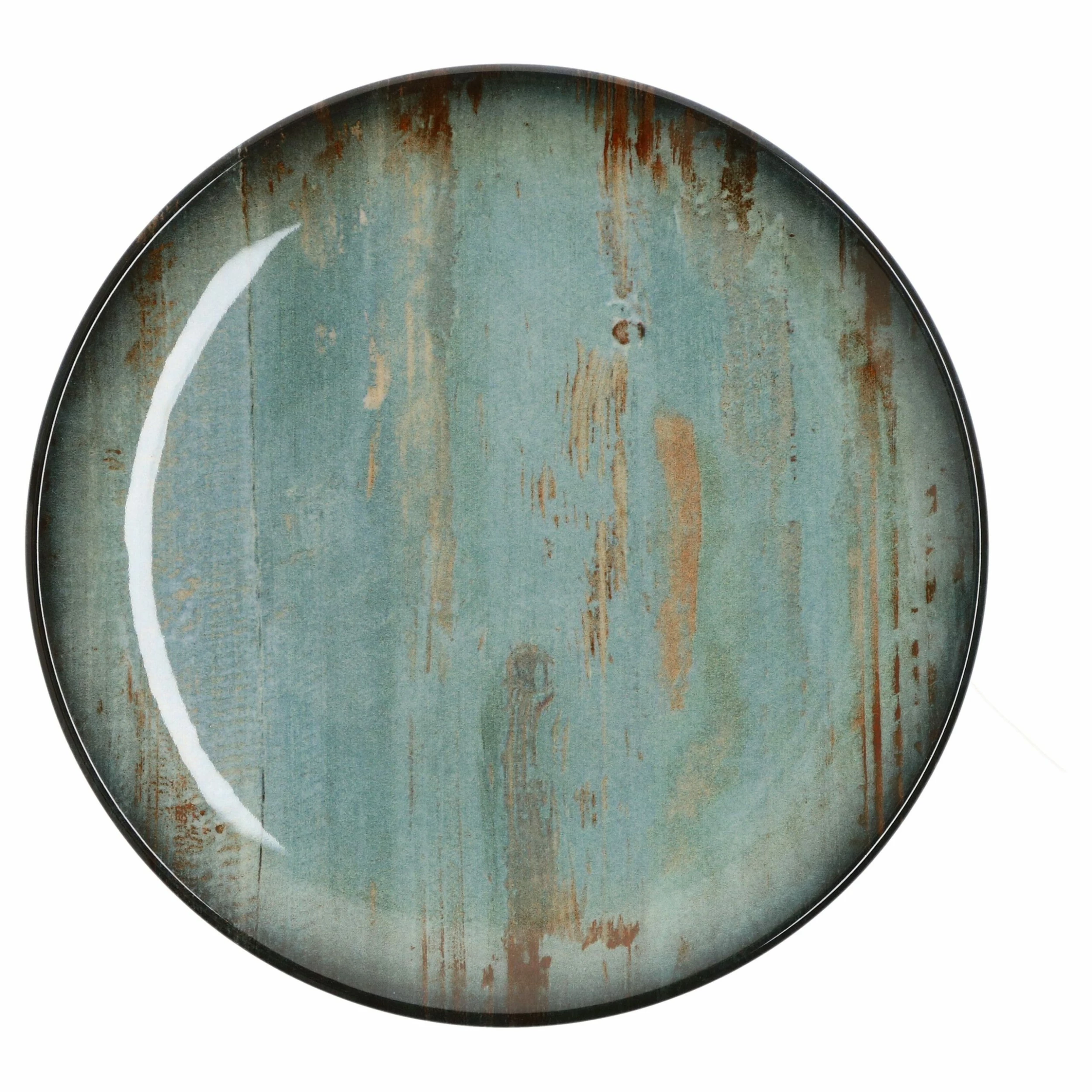 - Die Oberfläche ziert eine Holzstruktur in Mint, die durch kleine natürliche Holzfasern das gewisse Etwas, den so genannten Shabby Chic Look, erhält und von einem schwarzen Rand eingerahmt wird. Die Unterseite des Tellers ist schlicht in Cremeweiß gehalten.