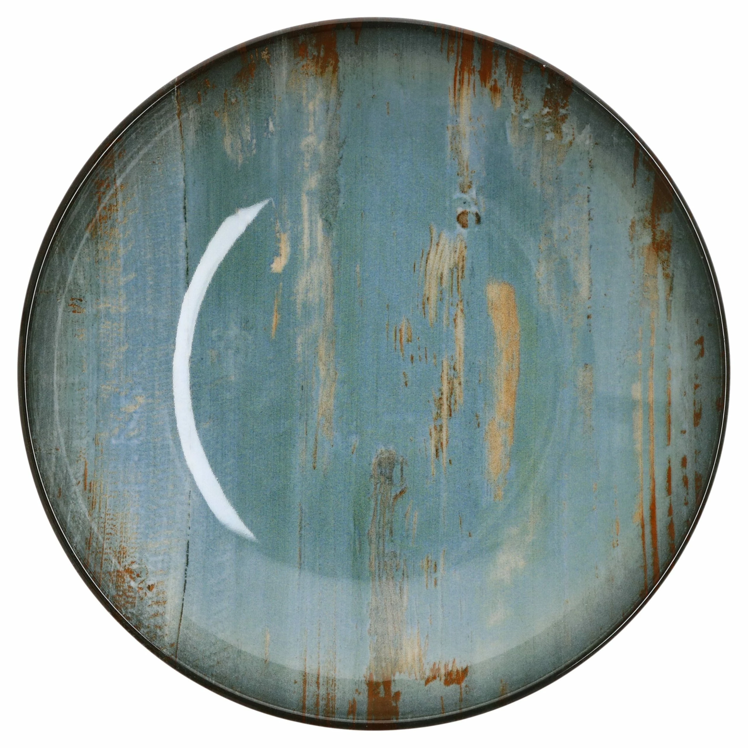 - Die Innenfläche ziert eine Holzstruktur in Mint, die durch kleine natürliche Holzfasern das gewisse Etwas, den so genannten Shabby Chic Look, erhält und von einem schwarzen Rand eingerahmt wird. Die Außenseite des Tellers ist schlicht in Cremeweiß gehalten.