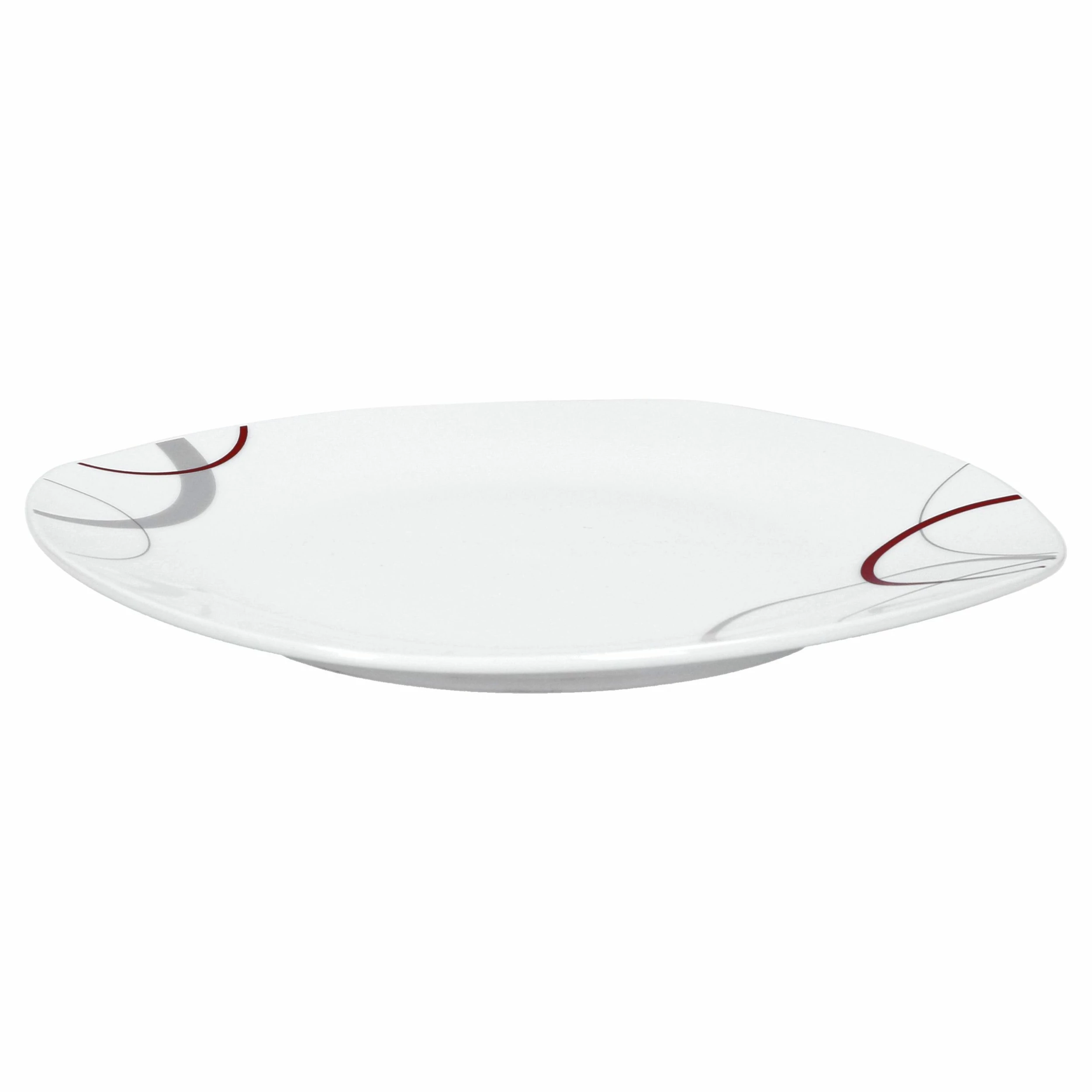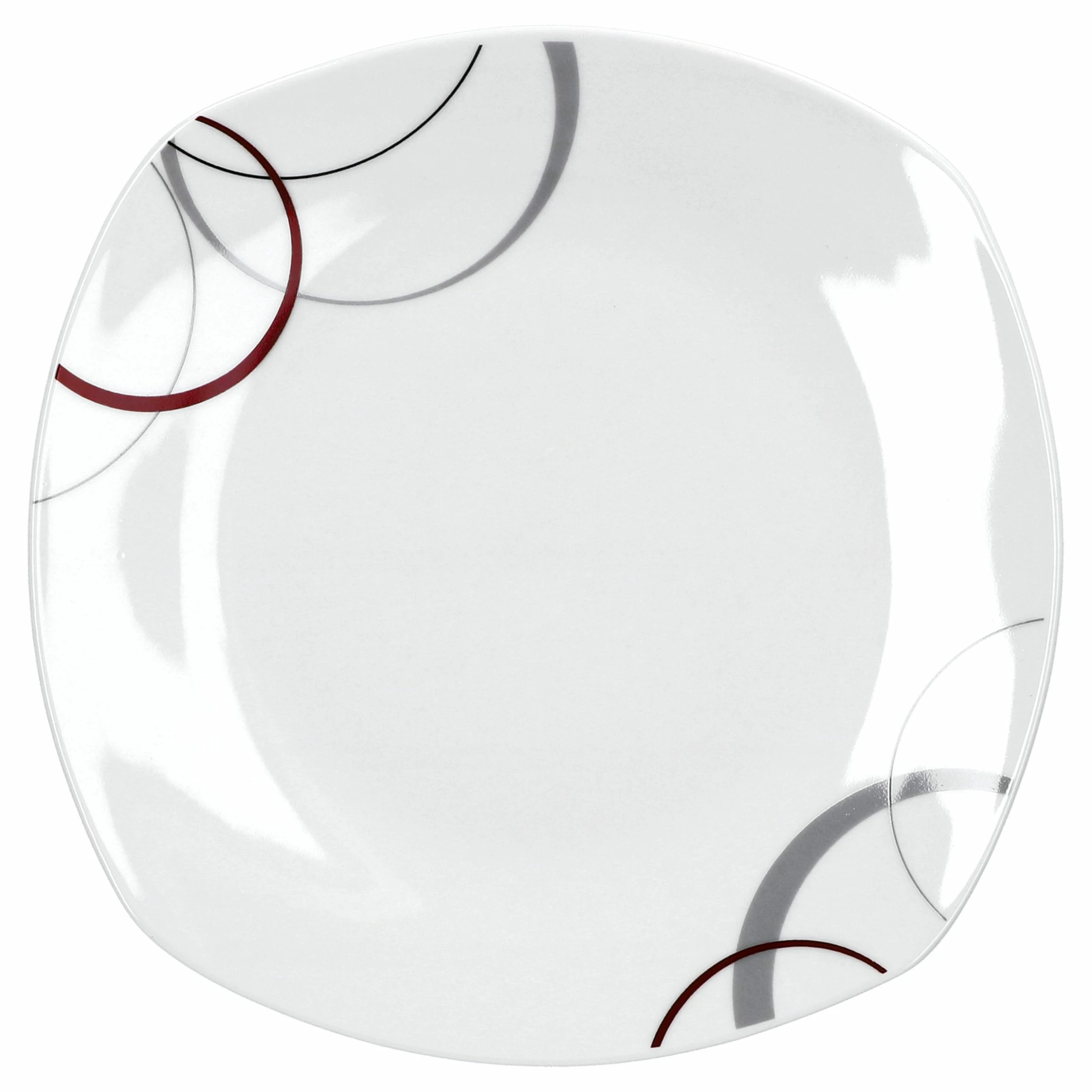 große und breite Kreise in den Farben grau und dunkelrot. Die Form der Teller ist leicht eckig –