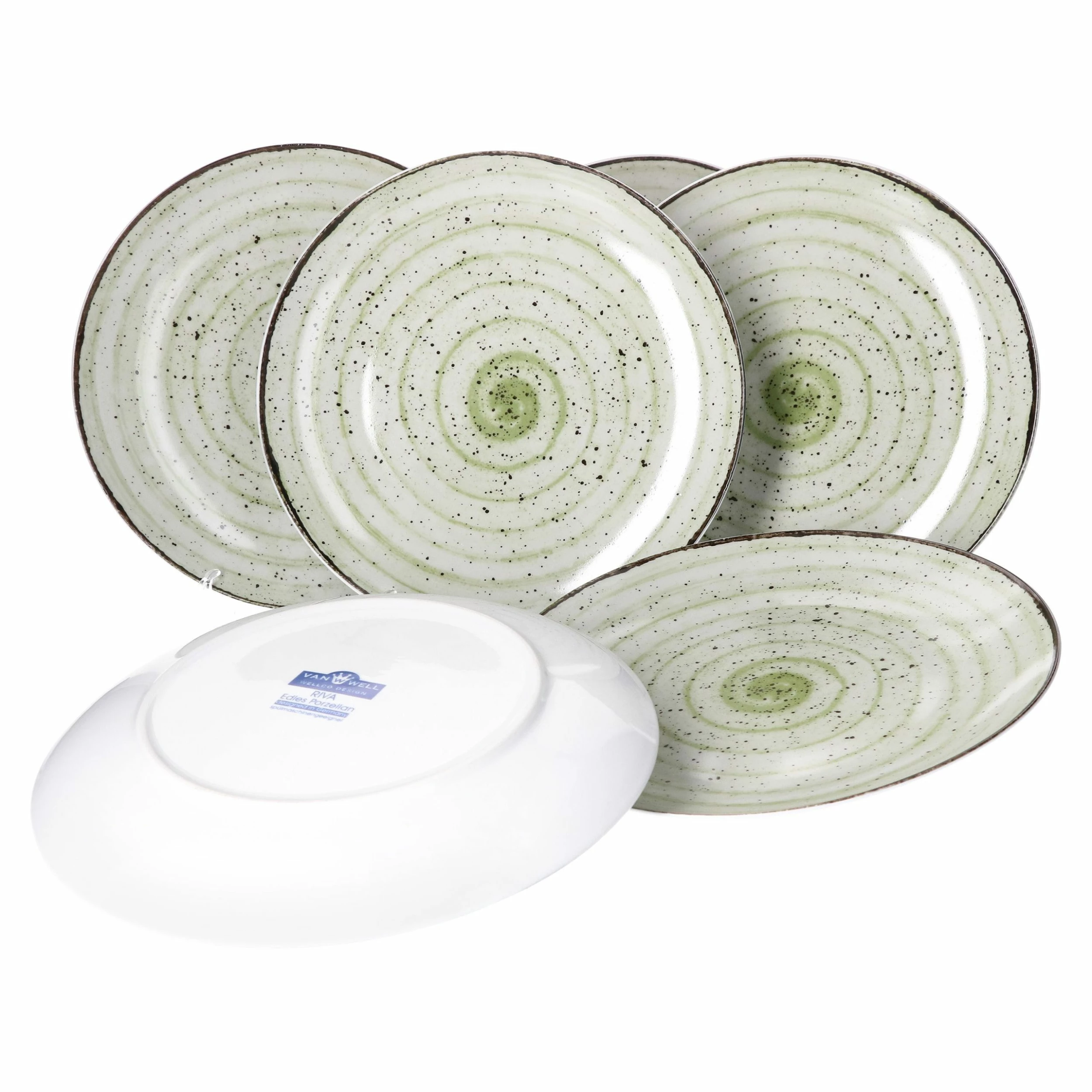 Das Van Well Essteller-Set Riva aus hochwertigem Porzellan, in runder Form mit dekorativem schilfgrünen Spiral-Dekor auf den Tellern, ist ein Hingucker auf jeder Tafel.