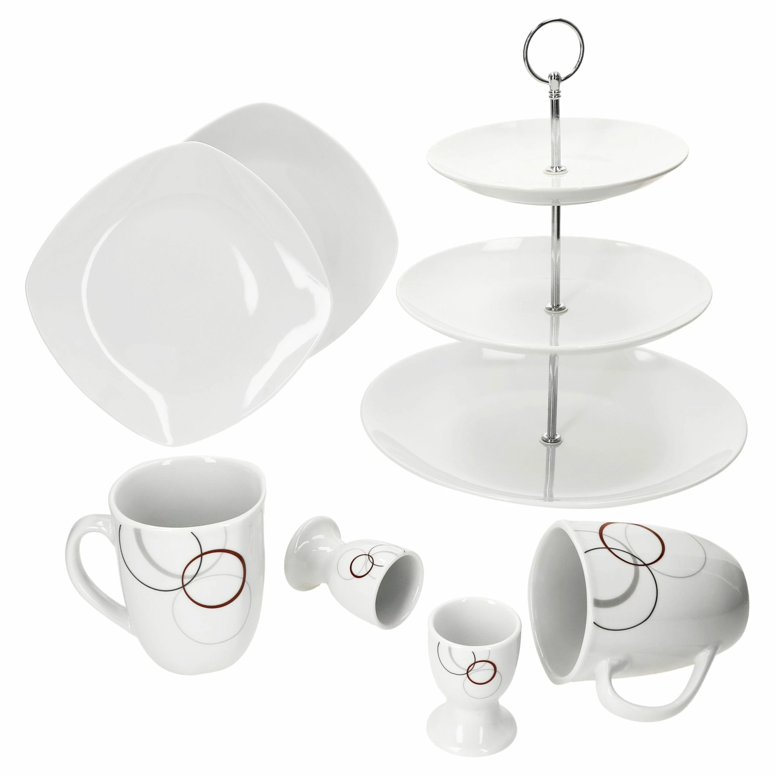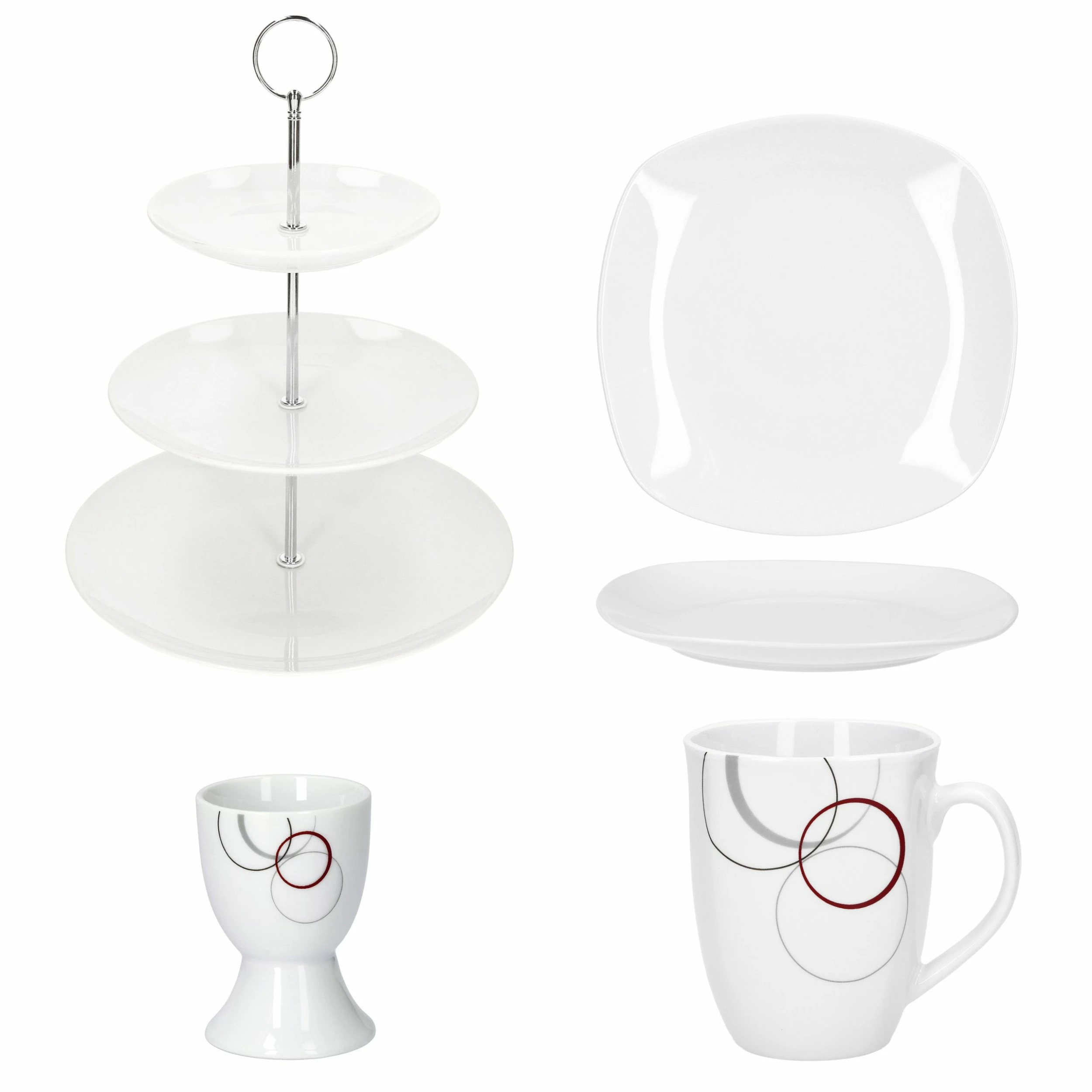 - Die Etagere sowie die kleinen Teller sind schlicht in Weiß gehalten, während die Eierbecher und Tassen mit unterschiedlich großen Kreisen in Grau, Schwarz und Bordeauxrot auf der Vorder- und Rückseite verziert sind