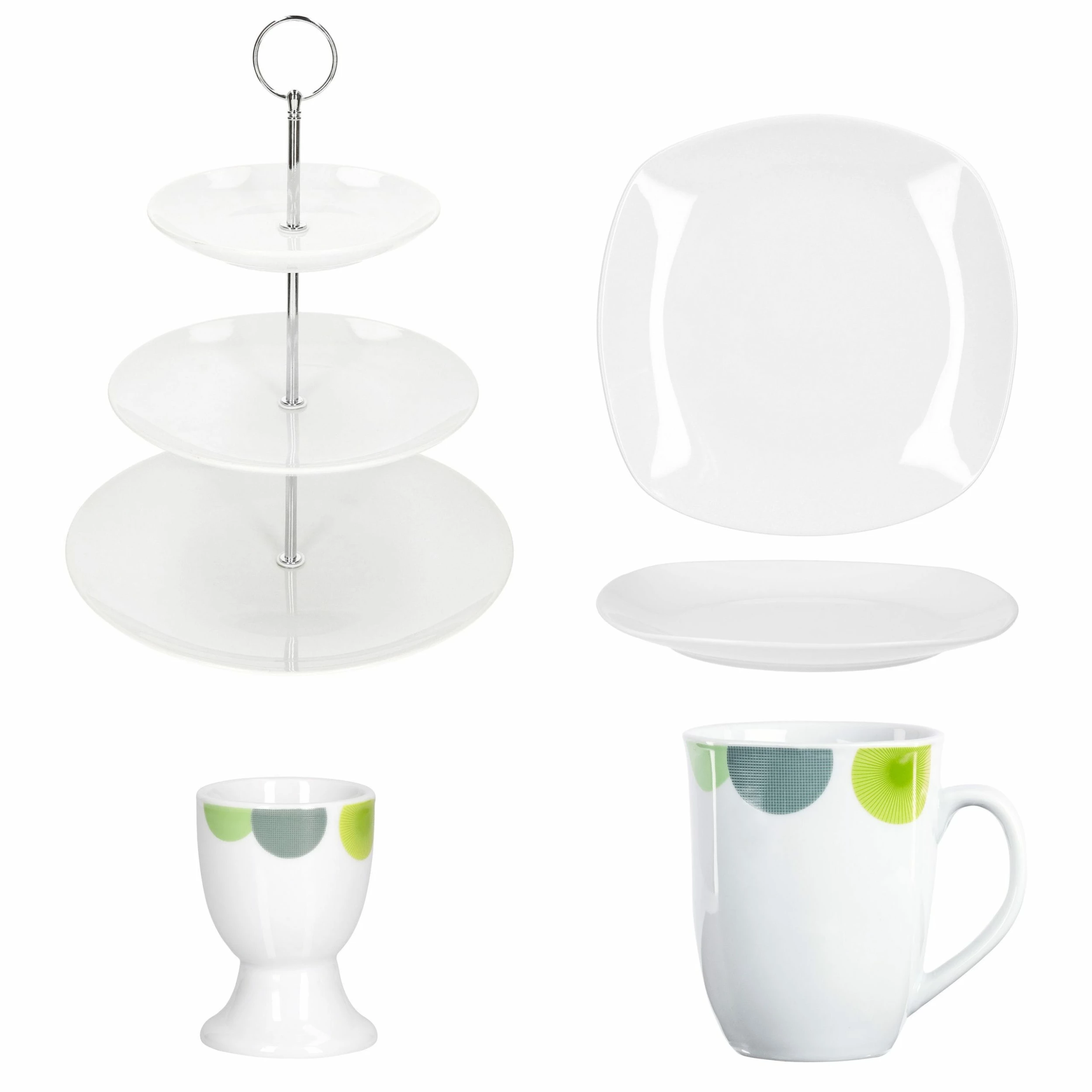 - Die Etagere sowie die kleinen Teller sind schlicht in Weiß gehalten, während die Eierbecher und Tassen mit strukturierten Retrokreisen in verschiedenen Grüntönen auf der Vorder- und Rückseite verziert sind
