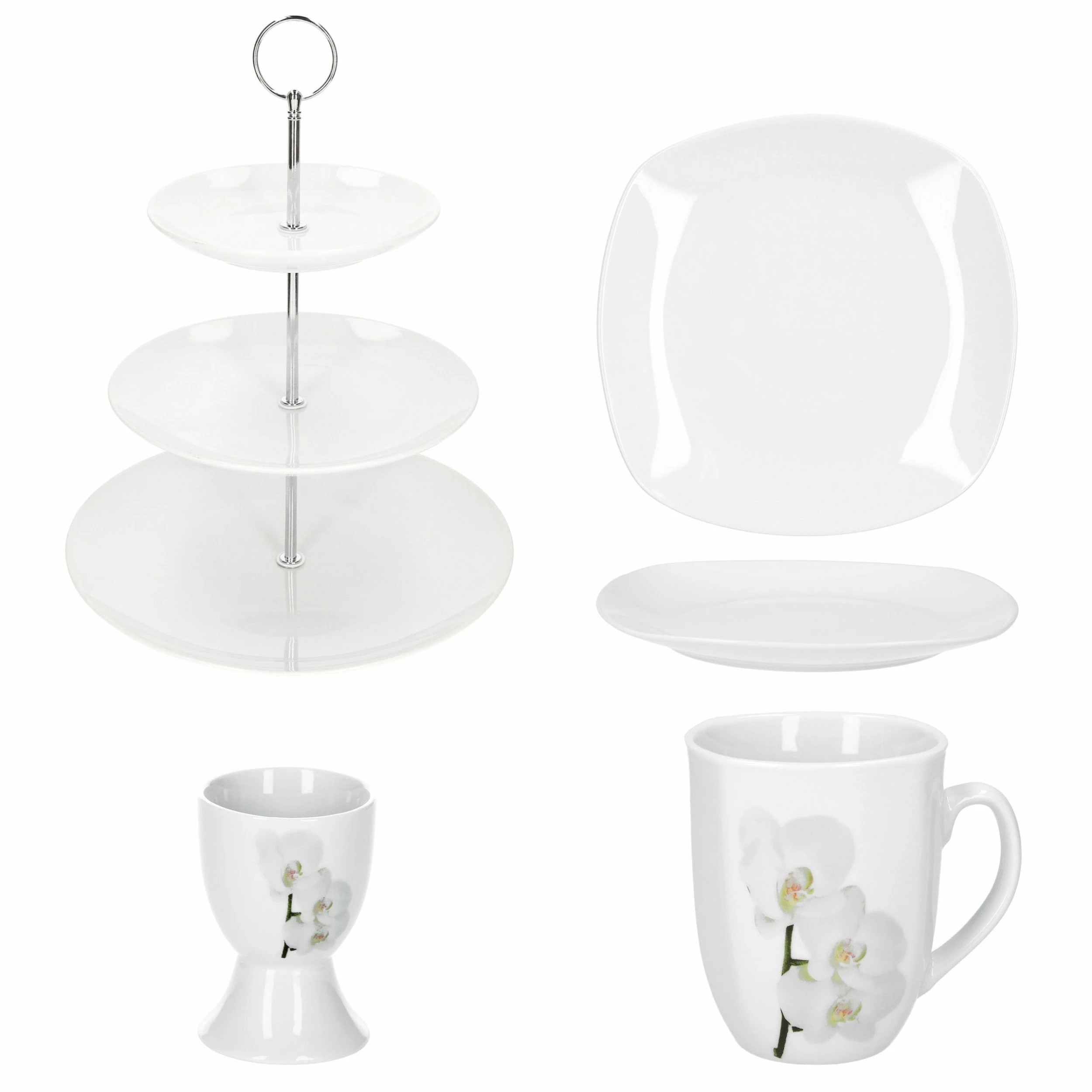 Versüßen Sie Ihren Morgen mit diesem hübschen Set mit floralem Dekor und sorgen für ein angenehmes Ambiente. 7-teiliges Lilli Vanda Frühstücks-Set Etagere 1x Etagere (3-stöckig), 2x Eierbecher, 2x Kaffeebecher 300 ml & 2x Frühstücksteller Alle Teile des Sets sind aus Porzellan gefertigt und Teller, Eier- & Kaffeebecher sind für 2 Personen geeignet Mit diesem schönen Etageren Set können Sie für Ihren Partner und sich ein außergewöhnliches Frühstück oder Kaffee kreieren und sorgen für unvergessliche Momente Die Etagere sowie die kleinen Teller sind schlicht in Weiß gehalten, während die Eierbecher und Tassen mit weißen Orchideen auf der Vorder- und Rückseite verziert sind Der Eierständer eignet sich hervorragend zum Servieren des klassischen Frühstückseies Mit einer Füllmenge von 300 ml ist der Pott ideal für Tee, Kaffee, Cappuccino, Latte Macchiato, Kakao sowie andere Heißgetränke Die Etagere hat drei unterschiedlich große Teller (Ø 16 cm, Ø 21 cm & Ø 27 cm) auf denen selbstgemachte Plätzchen, Bonbons & Pralinen sowie Mini-Muffins, Brownies & Co bereitgestellt werden können Servieren Sie auf dem Dessertteller sowohl Kuchen, Brownies als auch am frühen Morgen frische Brötchen oder Croissants Die Becher (mikrowellengeeignet), Eierbecher, Teller sowie die Platten der Etagere sind spülmaschinengeeignet Farbhinweis: Abweichungen in Farbe und Design sind Bestandteil des Handwerks Lieferumfang: 1x Etagere, weiß 3-stöckig Ø 27 cm, Gesamthöhe 34 cm, 1.400 g 2x Eierbecher Jeweils: Ø 5 cm, Höhe 7 cm, 60 g 2x Kaffeebecher Jeweils: optimale Füllmenge 300 ml bis max. 350 ml Länge 8,5 cm, Breite 8,5 cm, Länge mit Henkel 11,5 cm, Höhe 10 cm, 30 g 2x Kuchenteller, weiß Jeweils: Länge 19 cm, Breite 19 cm, Höhe 1,5 cm, 300 g