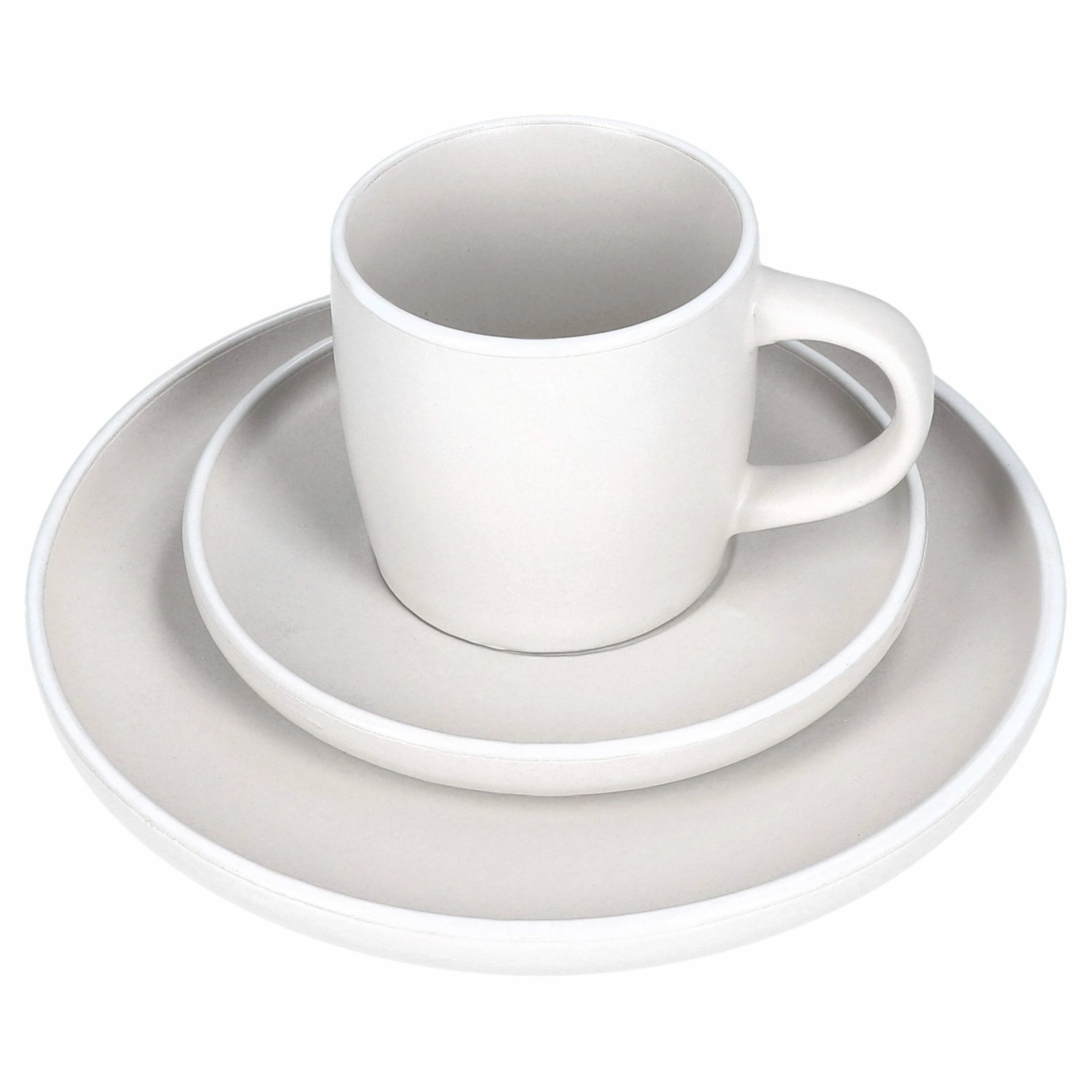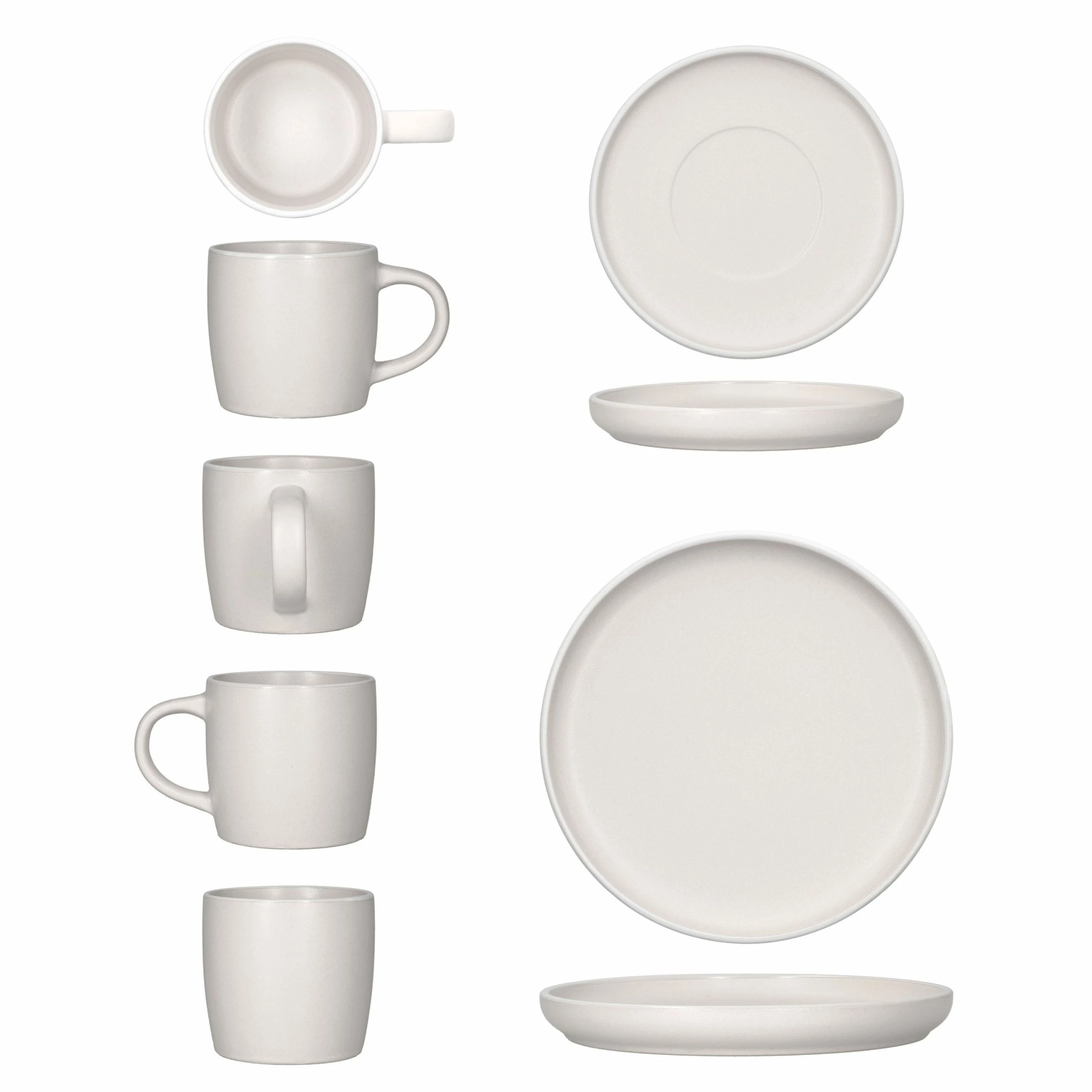 - Das hübsche Set überzeugt durch seine matt cremeweiße Optik, die durch einen hellen weißen Rand an jedem Geschirrteil abgerundet wird und daher spielend leicht mit unterschiedlichsten Farben und Deko-Accessoires auf dem gedeckten Tisch kombiniert werden kann