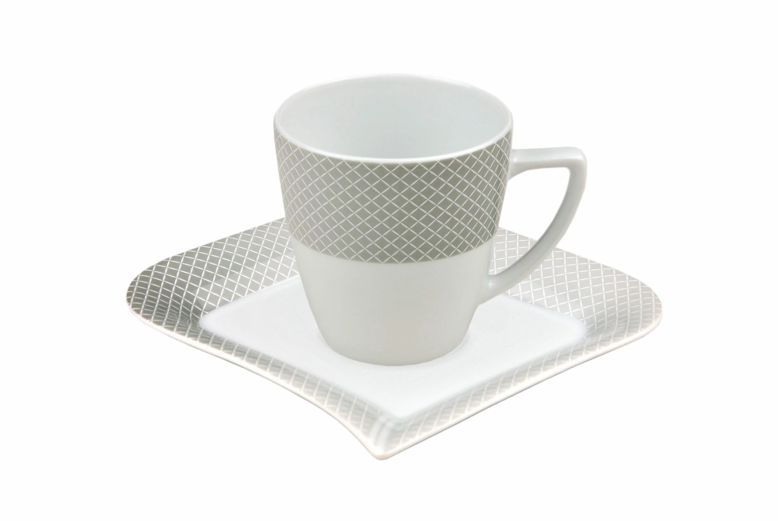 Ecke zu dunkelgrau verläuft. Die Tasse hat eine schöne schmale Becherform und hat das Muster am