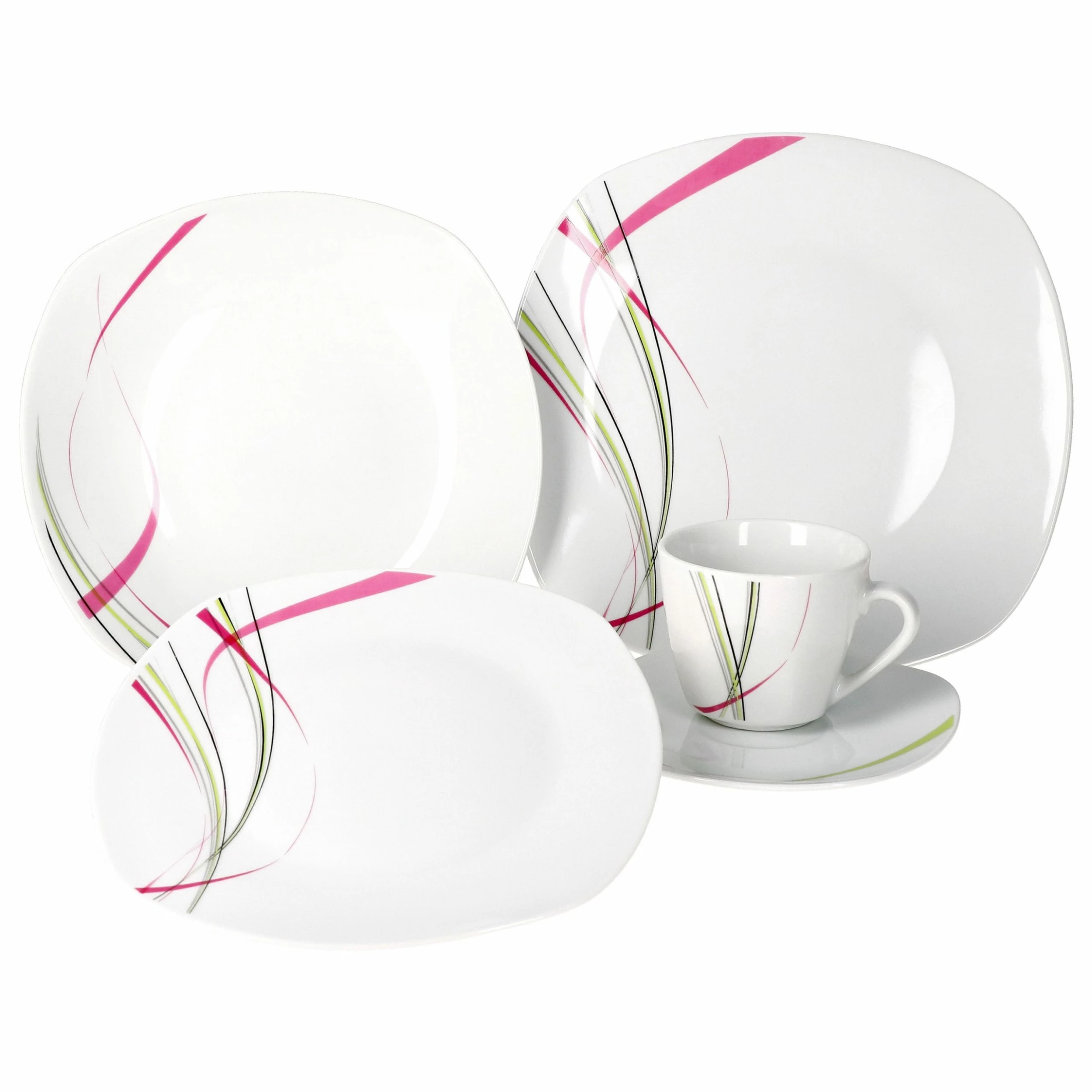 Die moderne Geschirrkollektion Fashion wirkt anmutig, sanft und wild zugleich. Ein erfrischendes Dekor, denn schleierförmig tanzen Streifen über das lichtgraue Porzellan und zieren in Pink, Grün, Grau und Schwarz das Kombigeschirr. Das vorteilhafte Set umfasst 30 Einzelteile und setzt sich aus einem 18-tlg. Kaffeeset und einem 12-tlg. Tafelservice zusammen. Es umfasst: 6 große Teller, 6 tiefe Suppenteller, 6 kleine Essteller für Kuchen und Dessert sowie sechs Kaffeetassen und passende Untertassen.